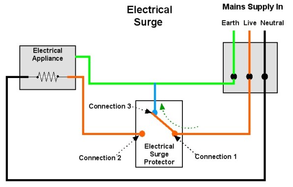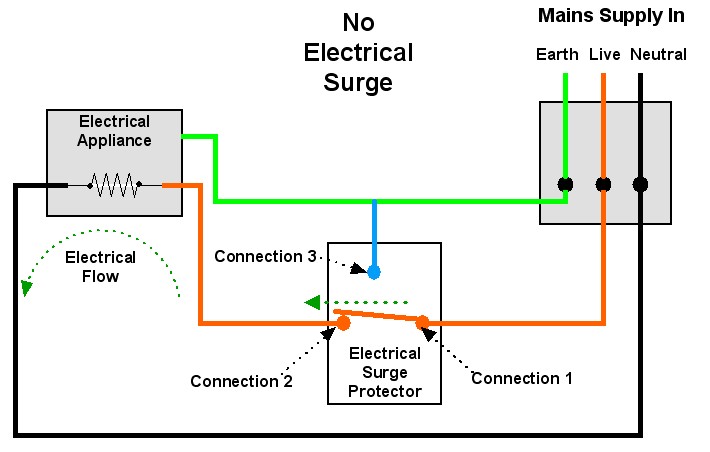 Electrical surge protectors work by diverting the extra energy in the electrical surge away from the main circuit, usually to ’earth’. In normal circumstances the electrical flow is along the ‘Live’ line (red), through the electrical surge protector, through the electrical appliance and back to the mains supply by the ‘Neutral’ line (black). Electricity flows through the electrical surge protector from connection 1 to connection 2 (green arrow). If the electrical surge protector detects an electrical surge it diverts the extra electrical flow to earth. When the surge protector detects an electrical surge it opens the path between connection 1 and connection 2 and closes the path between connection 1 and 3. When there is an electrical surge the electrical flow is from the ‘Live’ line (red) through connection 1 of the electrical surge protector then to earth by connection 3 (green arrow). The extra electrical flow taken away from the electrical appliance and sent to the earth line. If the extra electrical does not flow through the electrical appliance it cannot damage the electrical appliance.